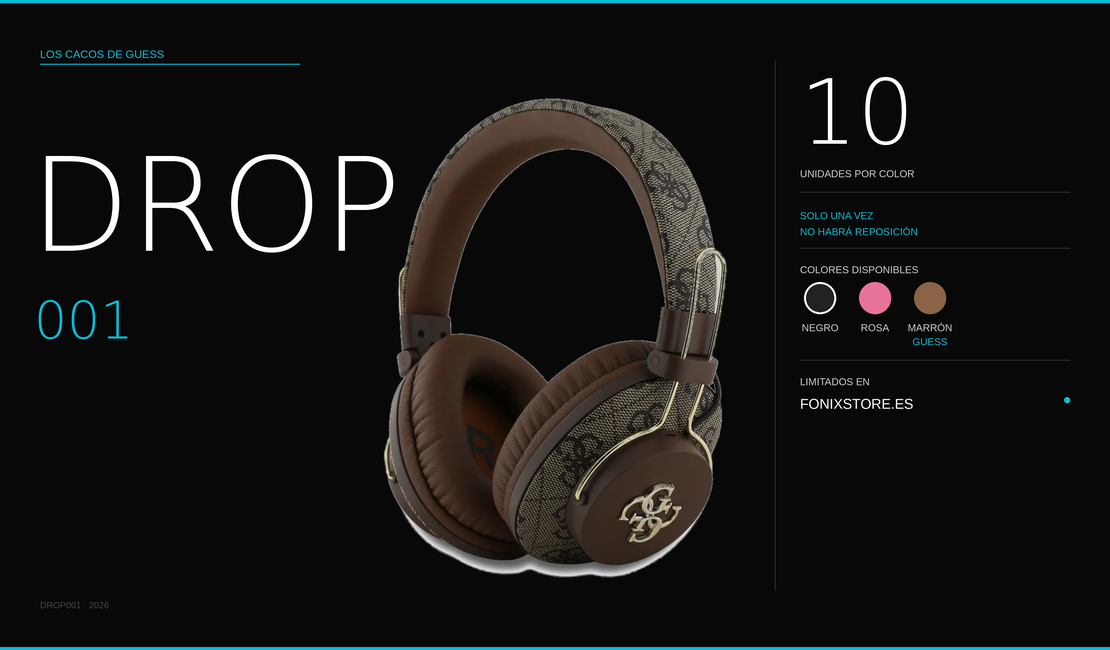 GUESS Drop 001 · Edición Limitada Auriculares premium. Bluetooth 5.3 · ENC · 30h · USB-C · Logo 4G dorado. Solo 10 unidades de cada color. Cuando se agoten, no vuelven.